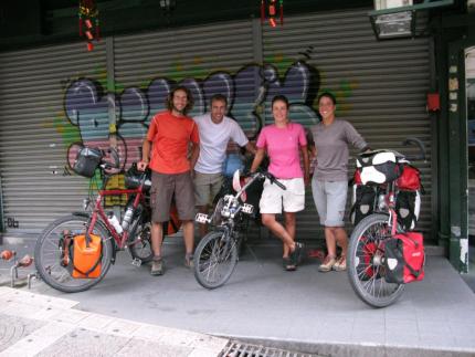 Sur cette route où il n'y a personne, à part le soleil et nous, je médite, assis en tailleur au pied de ma carcasse de vélo et j'attends que l'insolation vienne. Soudain on entend un véhicule qui arrive. C'est un 4x4 avec deux mecs dedans. Alice arrête le véhicule et demande aux gars de me déposer quelque part ou je vais pouvoir demander de l'aide, en attendant, elle reste surveiller les vélos. 5 km plus loin, je retrouve Jean-Christian et Emilie qui s'étaient arrêtés demander leur chemin. Je leur emprunte leur dérive chaîne et j'explique la situation. De retour avec Alice, je recommence le travail, mais l'énervement me fait faire des erreurs, je tords le maillon. Ce n'est vraiment pas du boulot. Tant pis, ça tiendra le temps que ça tiendra. Toutefois, je préfère ne pas pédaler dans les côtes trop raides, pour éviter de recasser tout de suite. Alors je pousse le vélo sur une poignée de kilomètres, au moment le plus chaud de la journée. Dans la grande descente qui suit, mon frein arrière fait un bruit horrible et ne freine plus du tout car j'ai oublié de le dire, mais dans l'ascension du col précédent, une vibration m'a alerté et j'ai bien fait d'y regarder tout de suite car c'était l'étrier de mon frein arrière qui était complètement dé-serré. En pleine descente, le frottement sur quelques centaines de mètres a chauffé le disque et l'étrier, nous sommes obligés de nous arrêter et d'attendre que cela refroidisse avant d'y toucher. GGGRRRRRR !!!! Nous sommes complètement épuisés lorsque nous arrivons à Kuala Lampur. Pour économiser le bricolage de la chaîne qui ne va pas tenir longtemps, je me fais remorquer par Alice. Comme vous pouvez imaginer, c'est un peu dangereux avec le trafic de la capitale, mais c'est toujours mieux que de pousser le vélo. Au passage d'un tunnel sous une route, en remontant tout seul la petite côte qui suit, Alice qui est devant moi, aperçoit Emilie et Jean-Christian au loin. Elle part en trombe et moi, juste à ce moment, je casse la chaîne dont le maillon se prend dans le dérailleur avant, qui se tord et vient se poser sur le petit plateau. Un éclair déchire le ciel. Un coup de tonnerre suit et soudain : le déluge. Je me fais rincer comme il faut et je finis par rejoindre les autres qui ont réussi à se mettre à l'abri, avant que le ciel ne leur tombe sur la tête. Pendant une demie accalmie, je fais demi-tour sur 3OO mètres car nous avions cru voir un magasin de cycle. Effectivement, un vieux chinois vend des vélos. En deux coups de pinces dérive chaîne ''made in Japan'', il me remet la chaîne en ligne.''