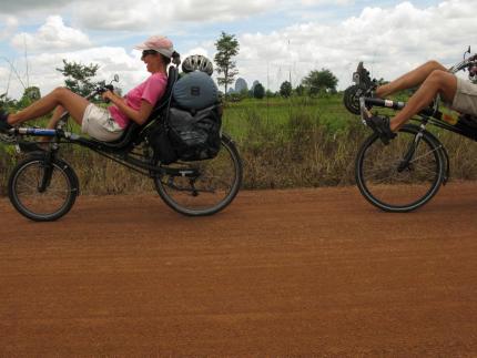 Le lendemain matin, nous profitons du buffet de l'hôtel pour prendre un énorme petit déjeuner ! Tout y passe !!! Au milieu des hommes d'affaires déjeunant en cravate costard, deux français en short et sandales s'empiffrent comme des ogres. Assiettes de riz et légumes vapeurs, salade de fruits, morceaux de pastèque, pain de mie grillé, beurre et confiture. A part la viande, nous mangeons de tout dans des proportions phénoménales. L'objectif étant de nous remplir le ventre pour la journée. Résultat, en 3 jours nous parcourons les 250 kilomètres jusqu'à la ville frontière. Le dernier jour de vélo en Thaïlande est sans aucun doute le plus beau et le plus agréable de tout notre séjour en ce pays. Nous quittons les grandes routes polluées pour des chemins de terre rouge. Le paysage devient enfin vraiment rural. Les gens sont heureux, gentils sincères. Les enfants jouent dans les ruisseaux. Nous nous arrêtons boire un verre d'eau fraîche dans un petit bistrot au bord de la route. Une femme nous emmène chez son frère, un ancien militaire reconverti en paysan pêcheur, qui vit au bord de ses deux étangs. Ils nous font déguster des noix de coco qu'ils cueillent pour nous, puis avant de repartir, ils nous offrent mangues et ananas du jardin.